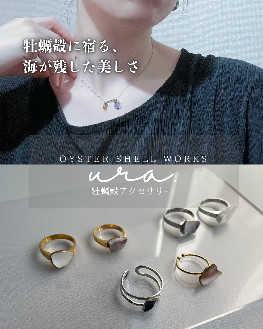 牡蠣殻×金継ぎ サージカルステンレスリング(ゴールド/ 8-9号) 日本の伝統の漆金継ぎと牡蠣殻を合わせた 個性派リングです。 牡蠣殻の特性の層の美しさが際立つ 美しい一点ものリングです。 --- リングサイズは8~9号ほどの内径です。 フォークリングなので、指の挙動にあうため窮屈感も軽減。 【サイズ】 -牡蠣殻サイズ- 約1cm×0.8cm ※0.1~0.2cmの誤差ございます。 1番長いところで測ってます。 -リングサイズ- 8号-9号ほど 【素材】 素敵な牡蠣殻 金継ぎ:合成漆、金粉 指輪金具:サージカルステンレス ※使用金具は金属アレルギーの反応が起こりにくいサージカルステンレスを使用しております。 【付属】 ちいさな麻袋 ≪oyster shell works ura.-ウラ-≫ 大船渡産牡蠣殻を使用した世界に一つだけのアクセサリー これほど綺麗で可能性を秘めた牡蠣殻を もっと愛してほしい。 そんな思いで大船渡出身であるura.オーナーが 一点一点ハンドメイドで製作しております。 自然にしか出せない牡蠣殻のデザインは 同じものはなく、世界に一つだけ。 ぜひ身近で魅力を感じてみませんか? 動画や新作情報をInstagramにも掲載しております。 ぜひご覧ください。 instagram @__ura.official