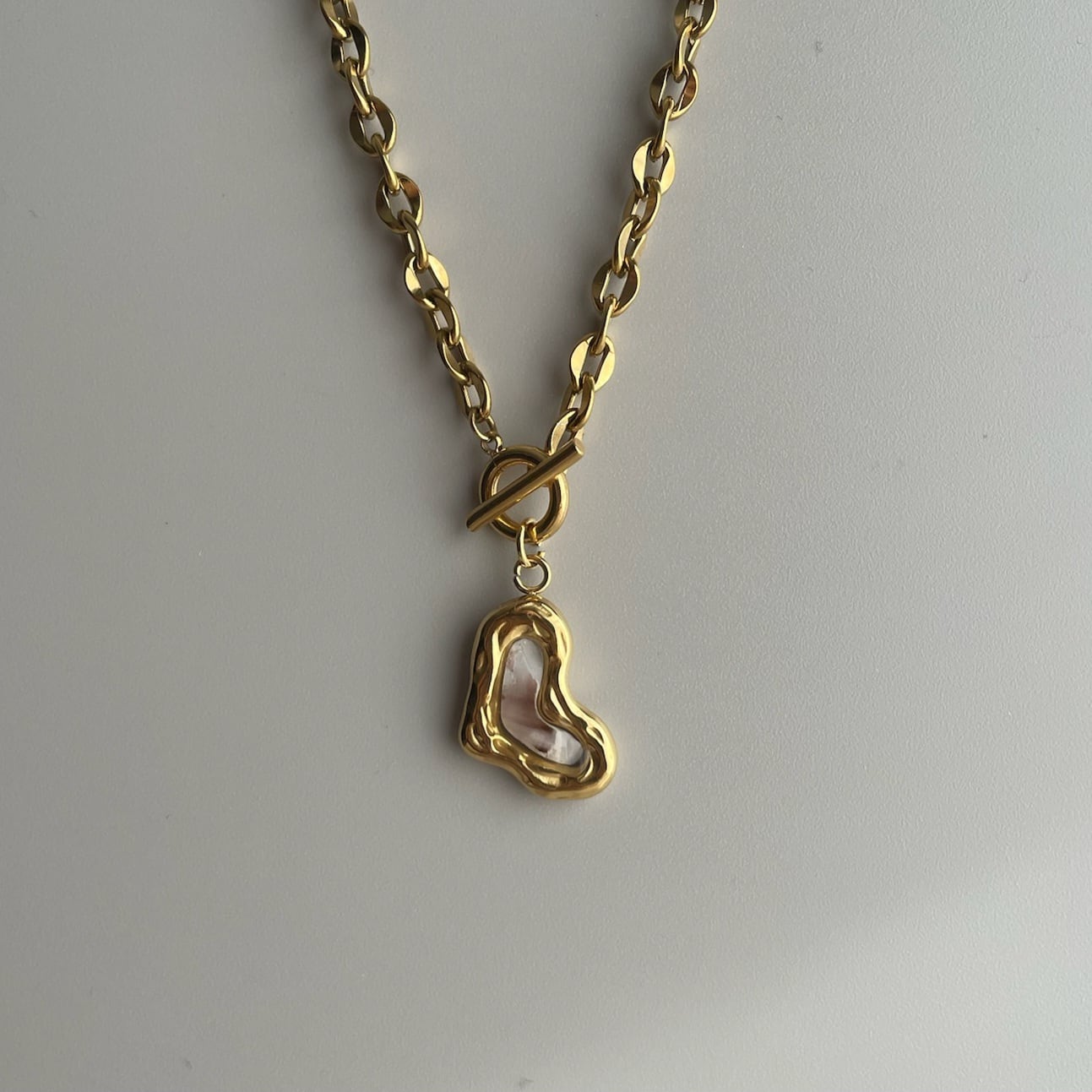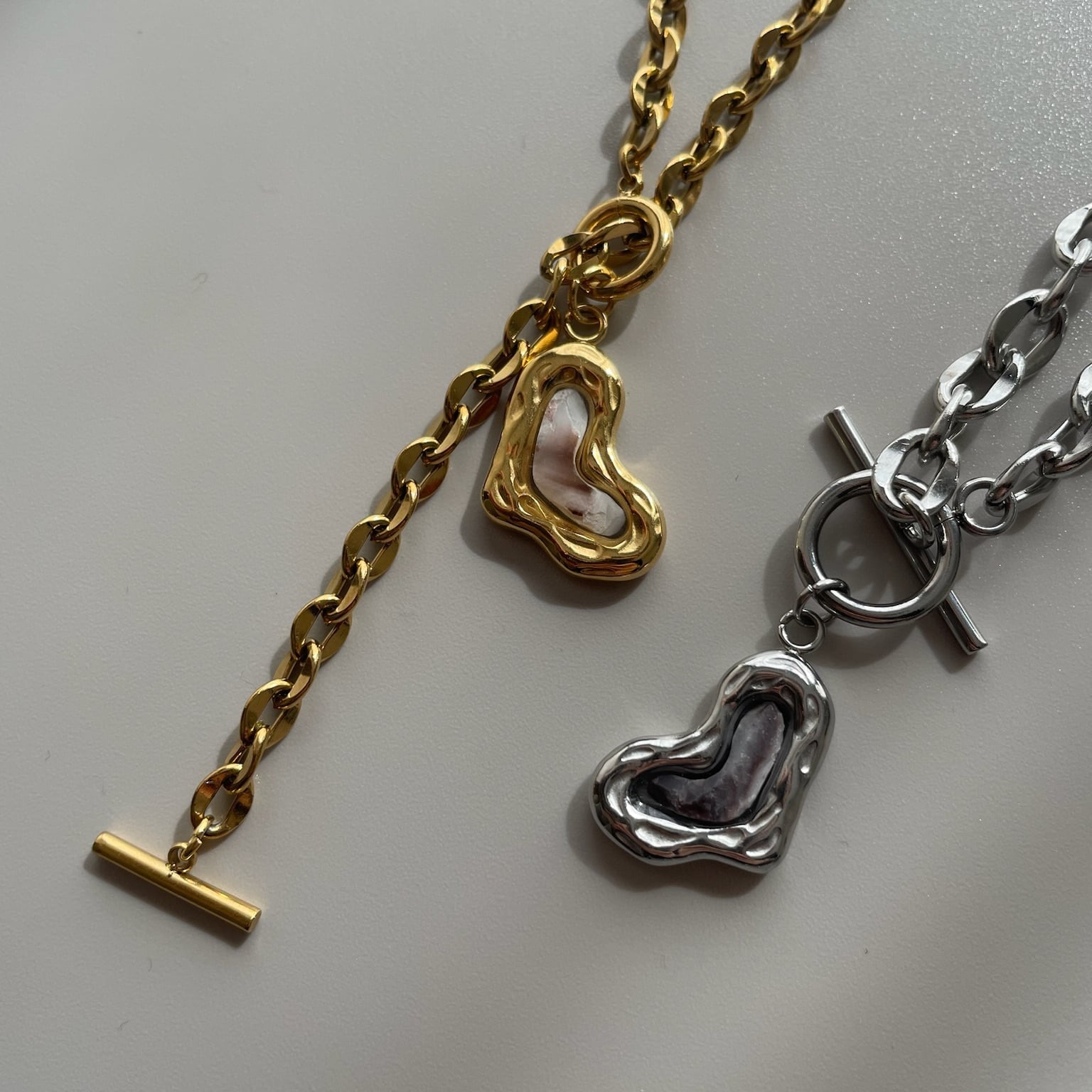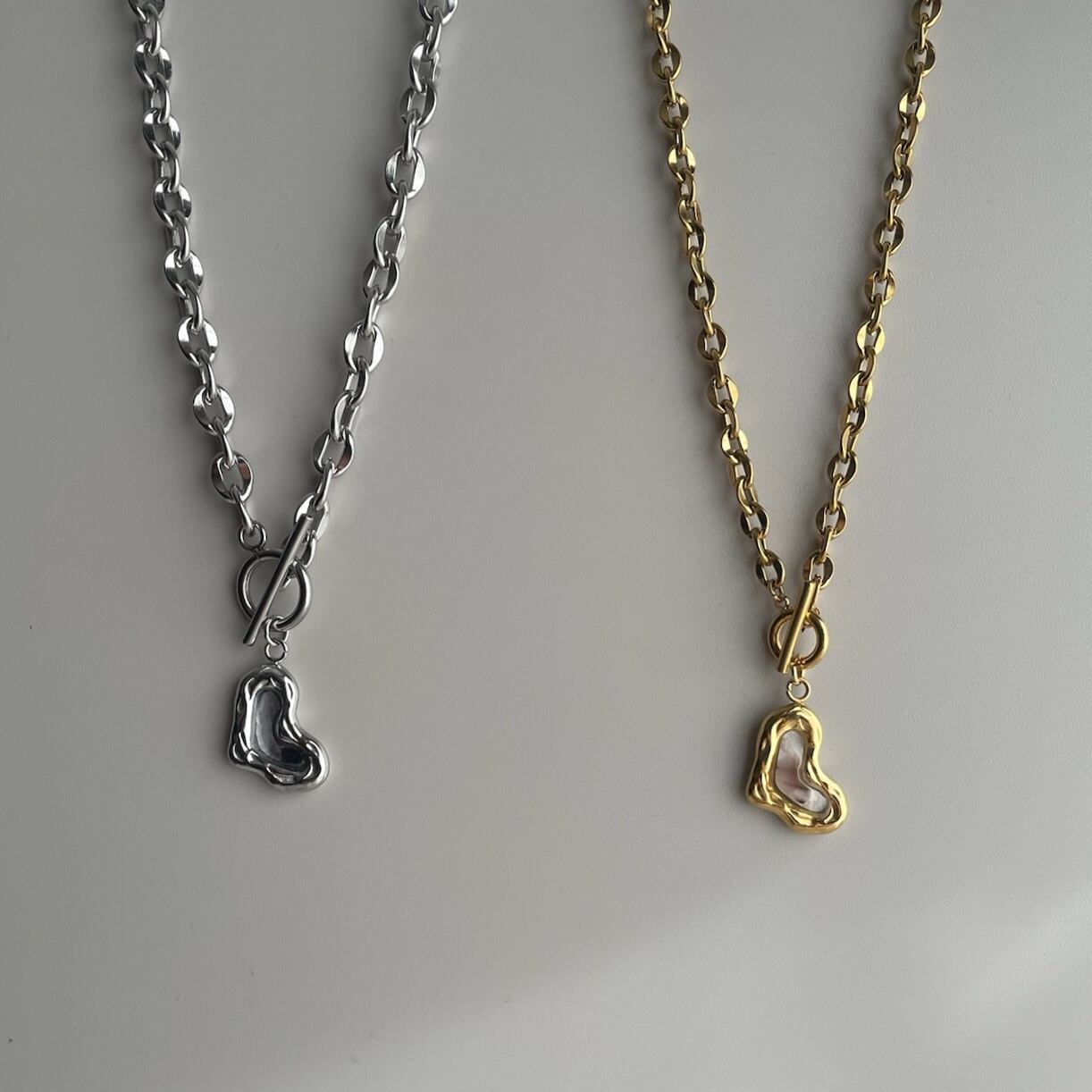 チェーンはシルバーとゴールドで太さを変えたデザイン。