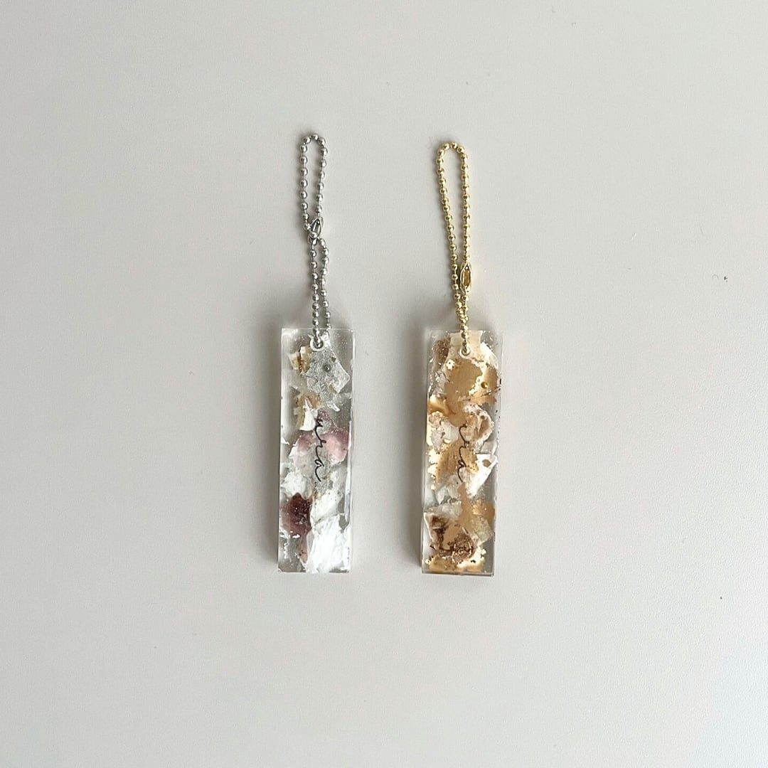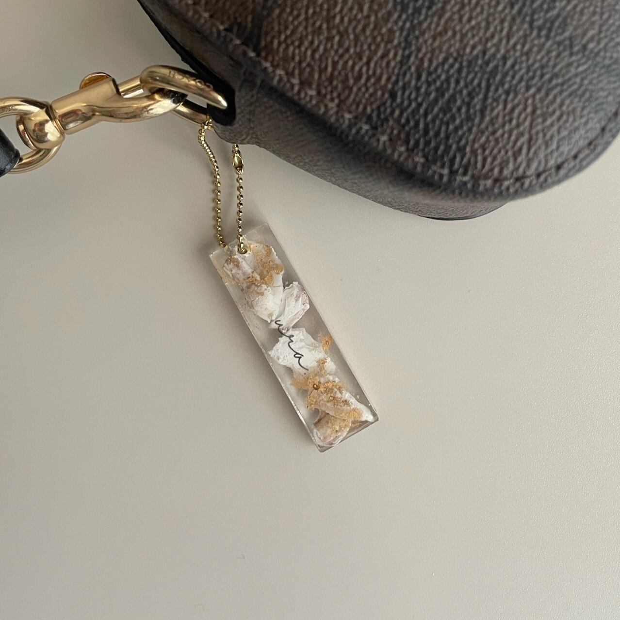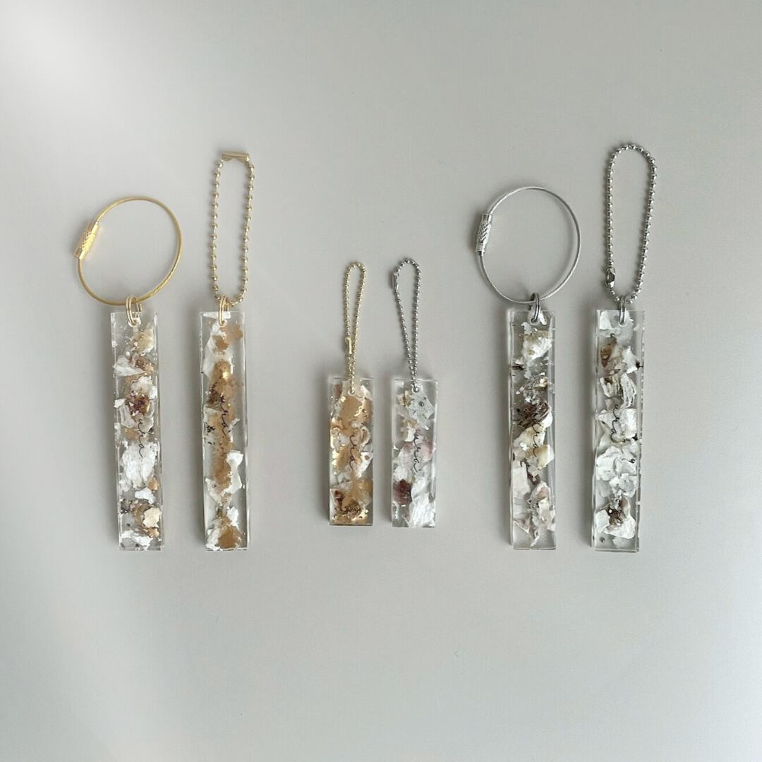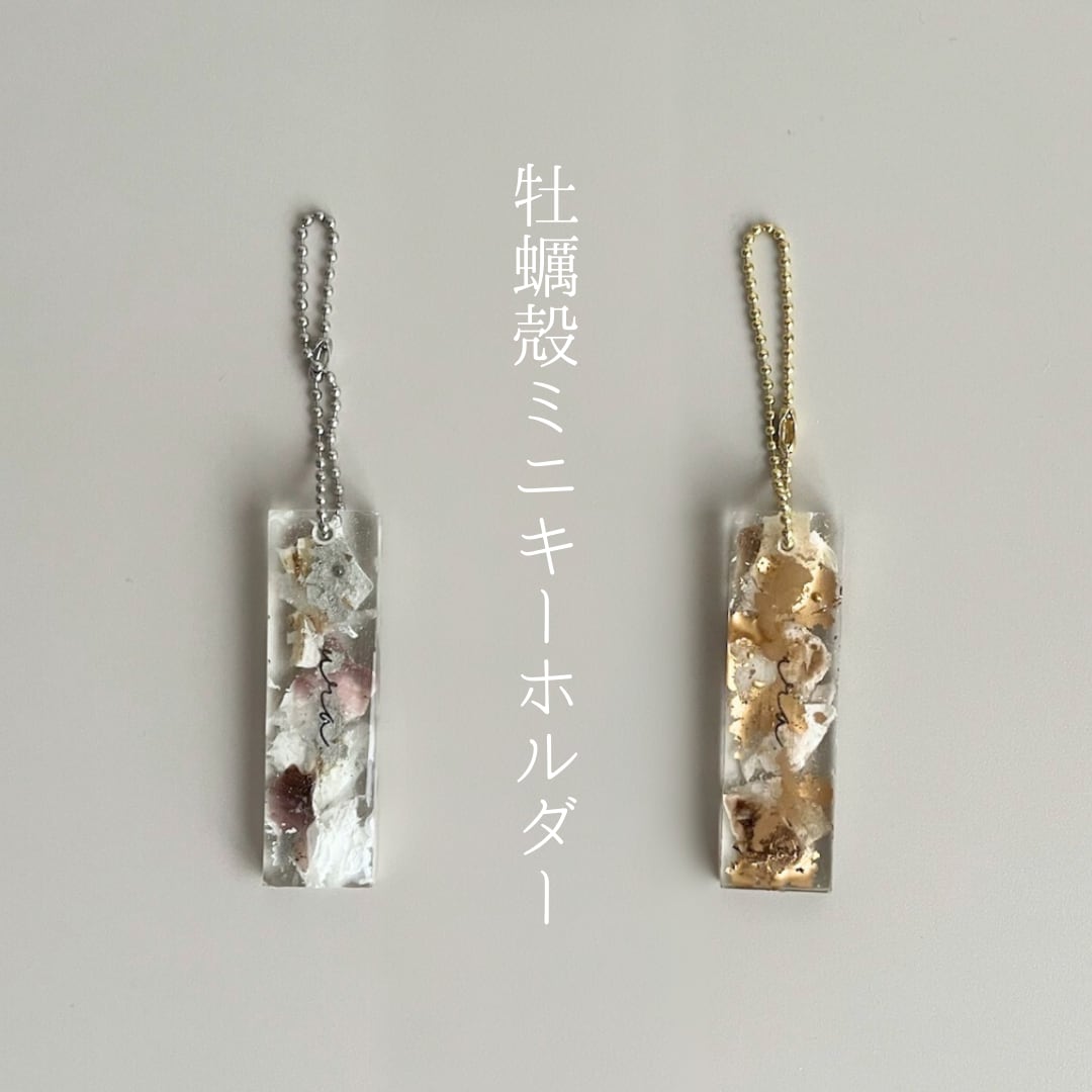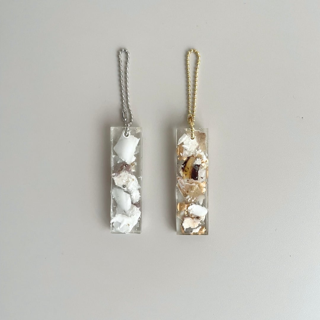 牡蠣殻の欠片を閉じ込めた、ミニサイズのスクエアキーホルダー。