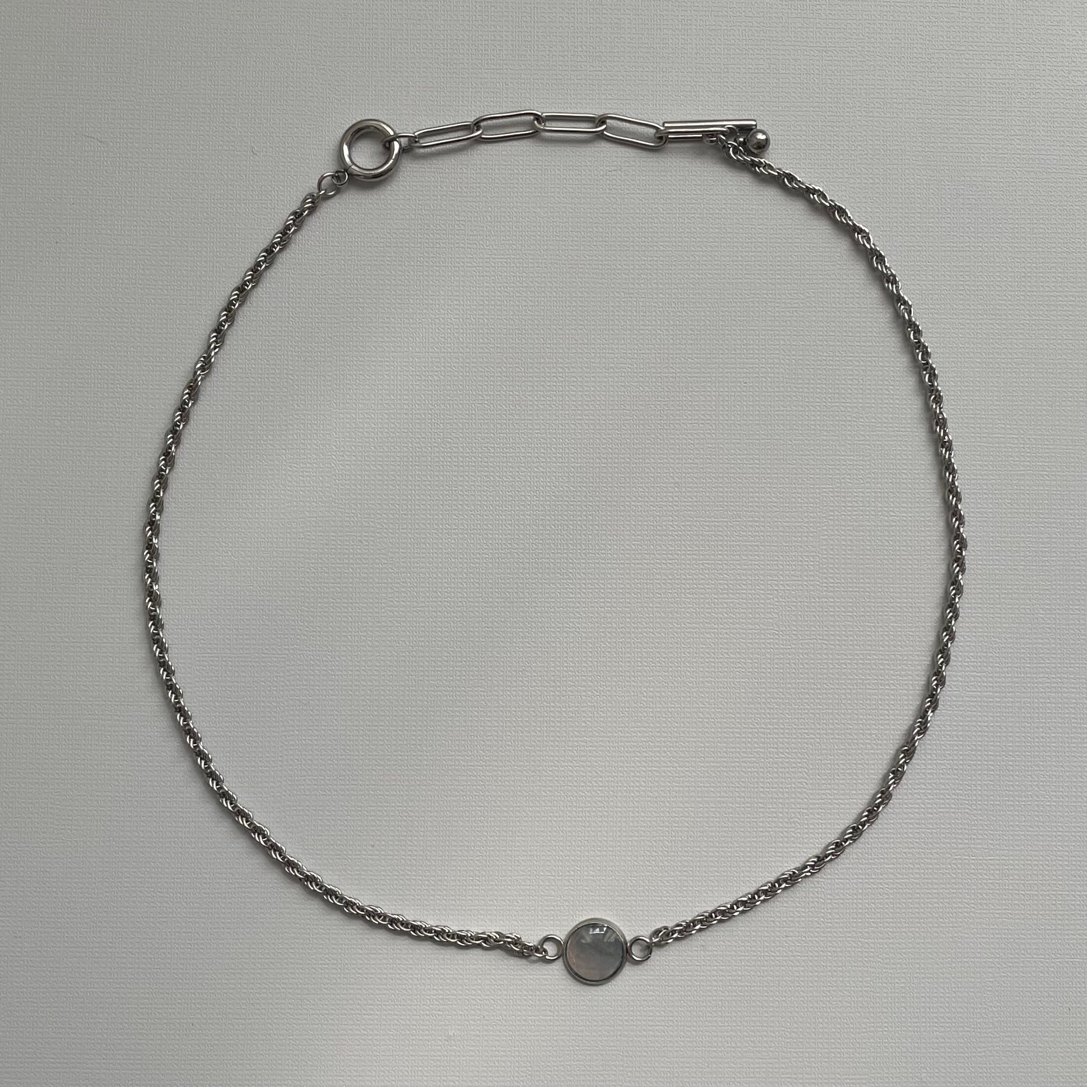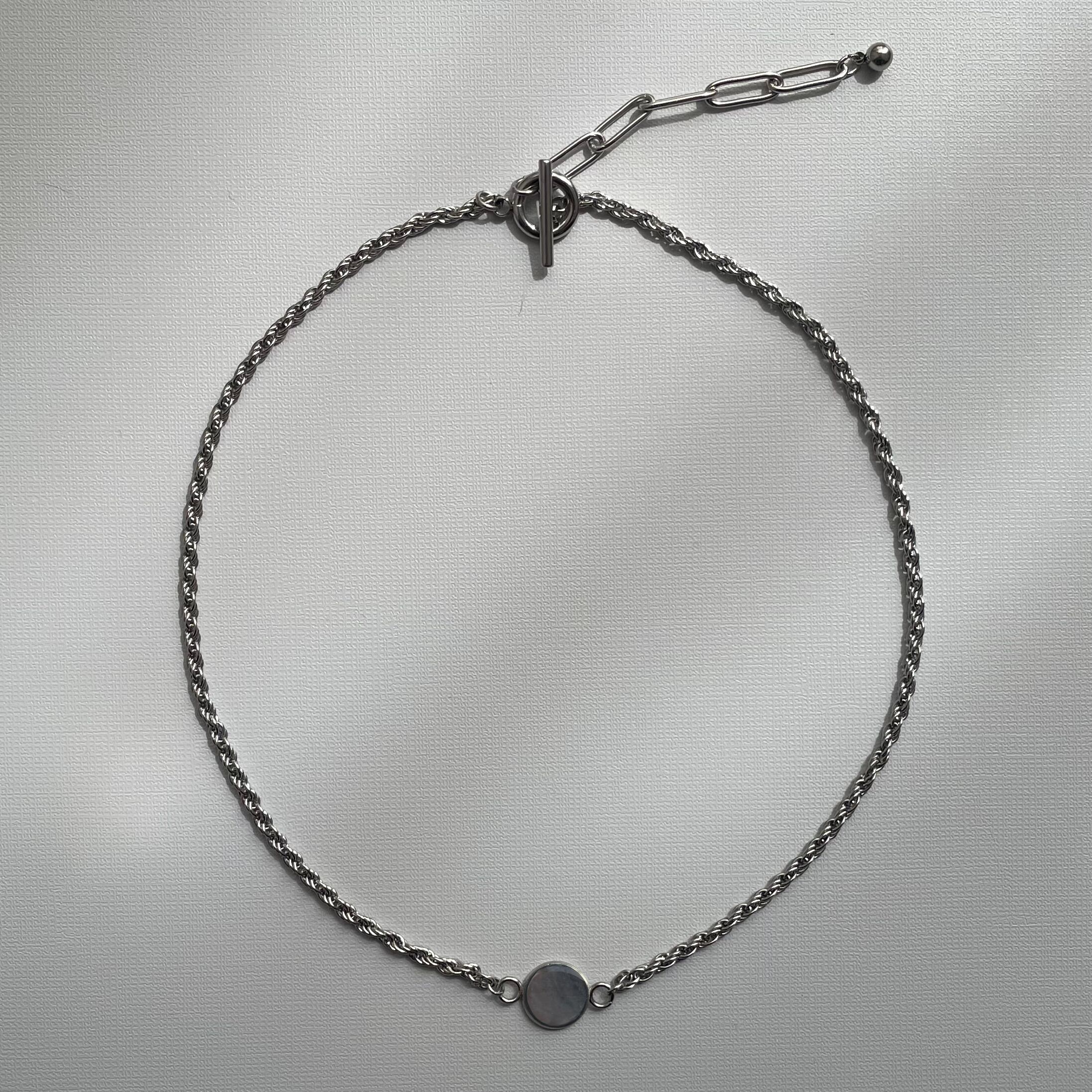 デザイン性のあるロープチェーンにサークルトップの牡蠣殻を合わせました。